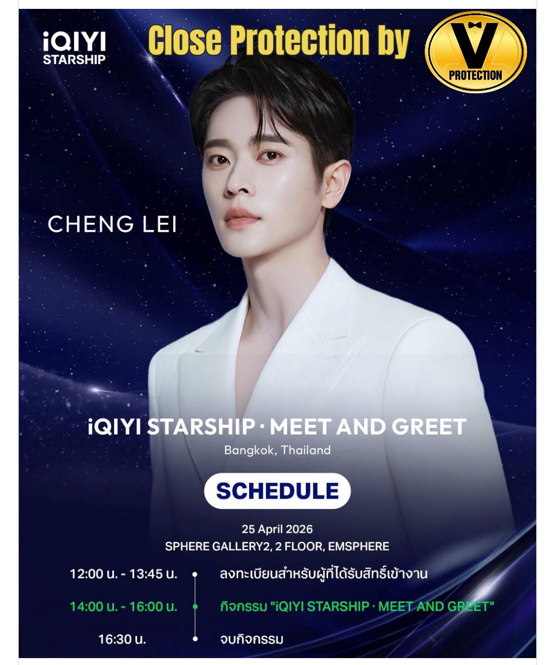 ครั้งนี้เป็นปีที่ 3 ที่ทีมของ บจก. รักษาความปลอดภัย วี โพรเทคชั่น (ไทยแลนด์) ได้รับความไว้วางใจให้เข้าดูแลความปลอดภัยของ เฉิงเหล่ย ศิลปินชื่อดังในงาน iQIYI Starship โดยจัดกำลัง Close Protection หรือ บอดี้การ์ดส่วนตัว จำนวน 4 นาย เพื่อดูแลอย่างใกล้ชิดตลอดภารกิจ